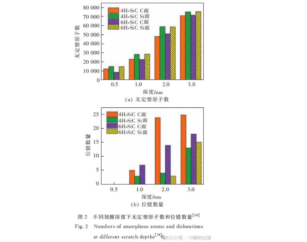 2020年,Z.G.Tian等人采用分子動力學(xué)模擬方法,對4H-SiC和6H-SiC的C面和Si面進(jìn)行了劃痕實(shí)驗(yàn),研究表明,與Si面相比,C面的非晶態(tài)變形更少,材料的去除更有效,這種劃痕現(xiàn)象與SiC晶體基面上的位錯有關(guān)。圖2為不同試件在不同劃擦深度下無定型原子數(shù)和位錯數(shù)量。2021年,P.Zhou等人采用分子動力學(xué)方法研究了多磨粒隨機(jī)分布的固結(jié)磨料拋光SiC基片的表面形貌、亞表面損傷特征。結(jié)果表明,多磨粒在單一粗糙面中的暴露高度和磨粒分布決定了SiC襯底的去除行為;金剛石顆粒在固結(jié)磨料拋光墊中的隨機(jī)分布會使加工質(zhì)量變差。