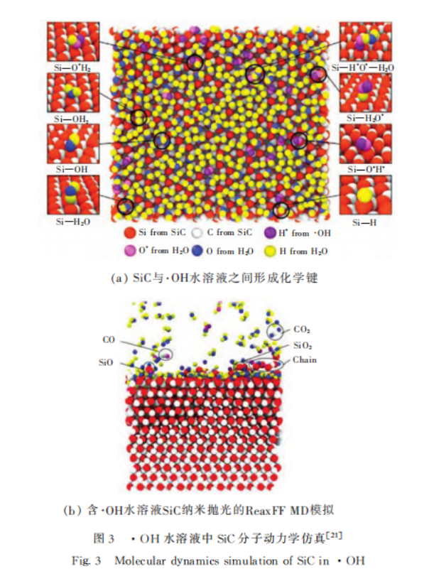 在CMP中除了存在與機(jī)械拋光相似的磨料劃擦作用外,化學(xué)作用的影響也至關(guān)重要。2021年,孫強(qiáng)采用分子動力學(xué)方法分別模擬了CMP中金剛石和SiO2磨粒對SiC表面原子去除機(jī)制。結(jié)果表明,SiO2在拋光過程中比金剛石更容易發(fā)生化學(xué)反應(yīng),原因是其通過與SiC表面原子持續(xù)成鍵和斷鍵來實(shí)現(xiàn)原子去除。2023年,Z.W.Yuan等人研究了SiC在羥基自由基(·OH)水溶液中的原子行為。結(jié)果表明,在只發(fā)生化學(xué)氧化的情況下,SiC表面吸附O、H、·OH生成Si—OH2、Si—OH、Si—H2O和Si—H等,Si原子未曾從SiC表面脫離,如圖3(a)所示。而在機(jī)械作用下,部分Si和C原子以SiO、SiO2、CO、CO2或鏈狀結(jié)構(gòu)脫離基體,其余Si和C原子則以吸附方式脫離基體,如圖3(b)所示。這些研究有助于從原子層面上解釋CMP中原子氧化去除的動力學(xué)過程,為揭示材料去除機(jī)理提供了一種有價(jià)值的方法。