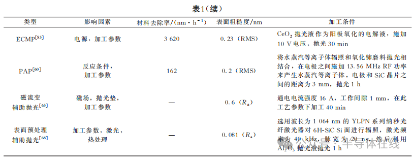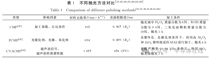 高效率地獲得光滑表面是半導(dǎo)體產(chǎn)業(yè)的一個關(guān)鍵問題,因此材料去除率和表面粗糙度被認(rèn)為是評價(jià)單晶SiC拋光工藝兩個最重要指標(biāo)。不同拋光方法之間的對比如表1所示。
