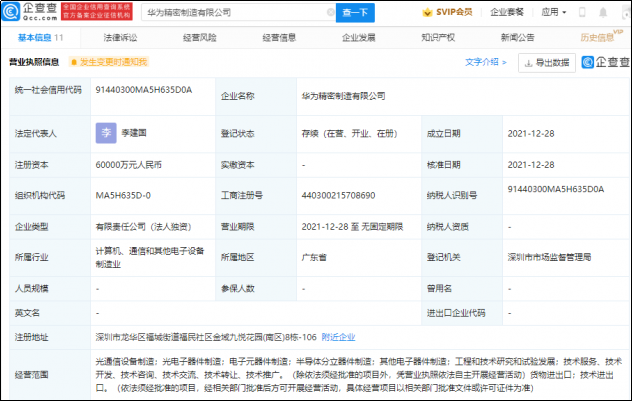 華為成立精密制造有限公司,注冊(cè)資本6億元人民幣,經(jīng)營范圍包含:光通信設(shè)備制造;光電子器件制造;電子元器件制造;半導(dǎo)體分立器件制造;其他電子器件制造;工程和技術(shù)研究和試驗(yàn)發(fā)展;技術(shù)服務(wù)、技術(shù)開發(fā)、技術(shù)咨詢、技術(shù)交流、技術(shù)轉(zhuǎn)讓、技術(shù)推廣。